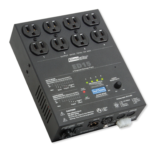 Take control of your light show with Eliminator’s ED-15. Its unique 4-channel dimmer pack is designed to control your light fixtures movement. This 15-amp controller features 16 automatic and sound activated built-in programs. The ED-15 also features 450 watts per channel and comes with analog in and out points. No more stress or headaches! Let the ED-15 take control of your light show. Great for home bars and party rooms.
