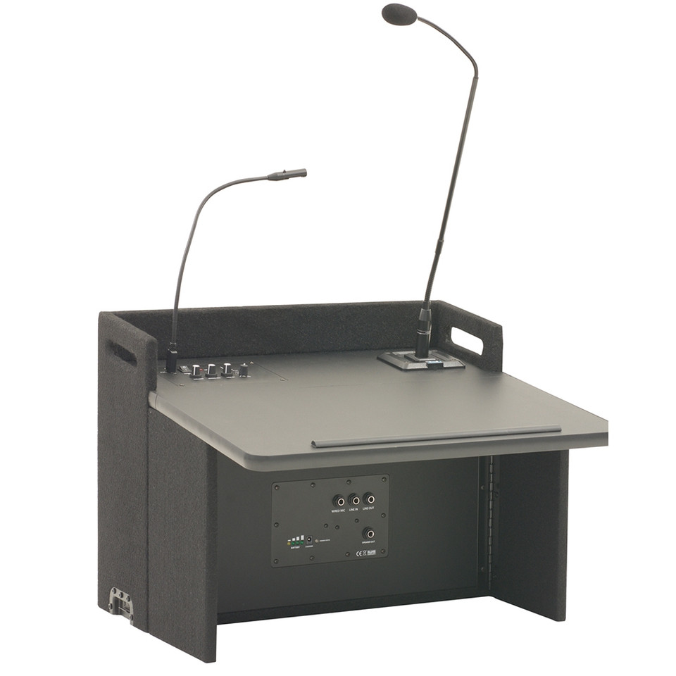 The Acclaim tabletop lectern comes with a built-in dual wireless receiver to connect up to two wireless mics.