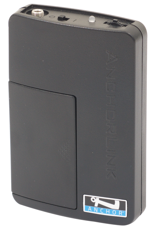 The WB-LINK is a wireless beltpack transmitter with a 3.5 mm connector plug. It operates on the 1.9 GHz frequency. The WB-LINK is powered by two AA batteries and operates approximately 6 - 8 hours with fresh batteries. Use the beltpack with the AnchorLink series.