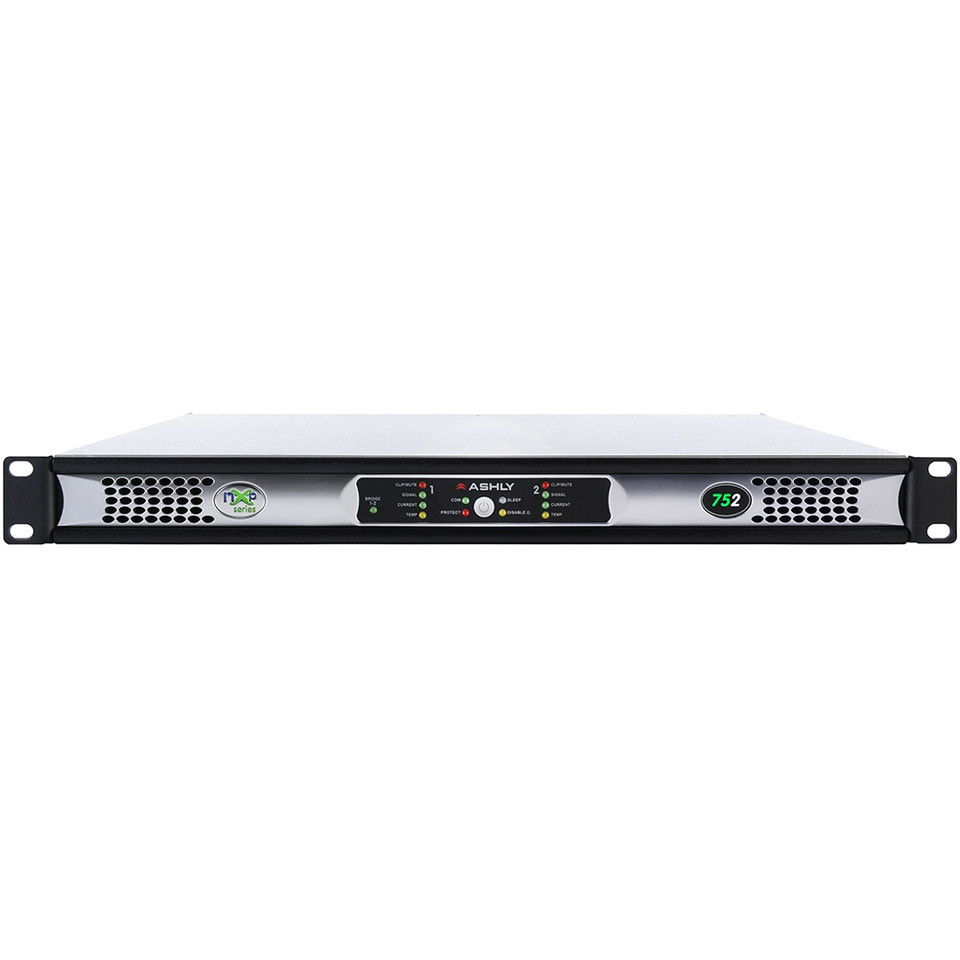 The unit shall be a 2 channel multi-mode amplifier capable of driving 2 Ohm loads at full power. The maximum rated output power shall be 75W per channel at Low Z, 75W per channel in 25V mode, 75W per channel in 70V mode, and 75W per channel in 100V mode. There shall be an automatic but defeatable sleep mode consuming <1W, and instant standby mode controlled by contact closure or software. A switch mode power supply with active power factor correction (PFC) shall auto-detect 100 – 240VAC mains and operate from 70 – 270VAC. Each channel shall have selectable output mode of Low Z, 25V, 70V, or 100V, an 80Hz high-pass filter, input limiter, and input gain settings of 26dB, 32dB, 38dB, or 1.4V. Each channel shall have remote DC level control. Input connectors shall be 3.5mm Euroblock, while output connectors shall be 7.62mm Euroblock. The unit shall have a front panel power switch and rear level controls that can be disabled. LEDs shall indicate Protect, Sleep, Disabled, and Bridge mode status, as well as Temperature, Output Current, Output Signal, and Clipping/Mute status per channel. The unit shall have Ethernet control with a real-time clock for event scheduling. The unit shall have serial data remote control, aux preamp outputs, preset control, and fault condition logic output per channel. The unit shall have optional factory installed network audio or AES3 digital audio capability. The unit shall have 32-bit DSP processing at 48kHz or 96kHz sampling rate. DSP functions shall include swept load impedance, gain, dynamics including autoleveler and ambient noise compensation, equalization including graphic, parametric, feedback suppressor, and FIR filters, a matrix mixer including automixing, crossover, delay, and a signal generator. The amplifier shall have temperature dependent variable speed forced-air cooling. The unit shall weigh <12.1 lbs (5.5kg), measure 19”W x 1.75”H x 14.54”D (483mm x 45mm x 369mm), and mount in a standard 19” rack. There shall be a five year warranty for units purchased in the US. No other unit shall be acceptable unless all specifications represented herein are met or exceeded and submitted in writing by an independent testing agent. The power amplifier shall be an Ashly nXp752.