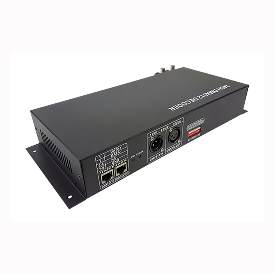 Komply DMX-24 is a 24-channel (8x RGB) DMX decoding driver designed to convert a universal DMX512 digital signal to PWM signal. It can be controlled by DMX512 console, with 256-level gradation.