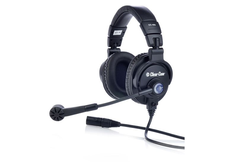 Double enclosed ear headset with superior audio quality and on/ off switch in gooseneck microphone boom includes HS-ES ear socks and headset bag - field removable six-pin male XLR.