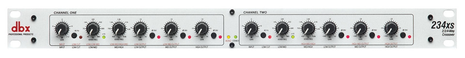 The dbx 234xs is a dual channel crossover with all the features you would expect from a professional product. It features Linkwitz-Riley 24dB per octave filters, independent output gain controls for level matching, output phase inversion, 40 Hz low cut filter, and optional mono summing of the low frequency (subwoofer) output. Everything in the design exudes great precision from the solid "click" controls to the high quality XLR inputs and outputs