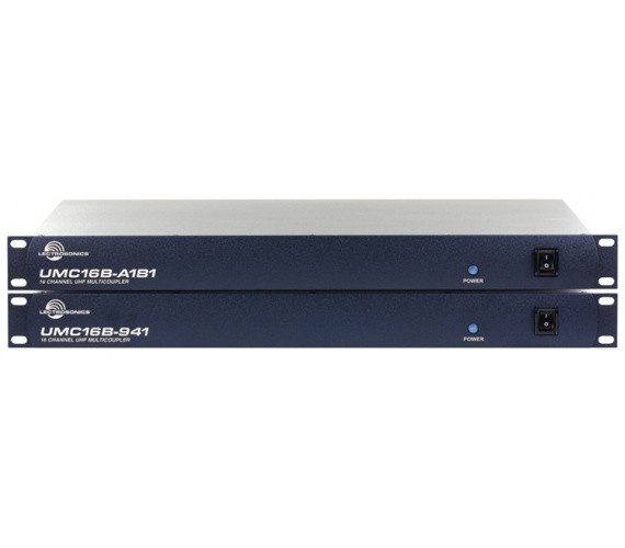 The UMC16B multi-couplers are used to distribute signals from two antennas to eight diversity receivers to minimize the amount of cabling and antennas needed in multi-channel wireless systems. The design combines high-quality ceramic filtering with low noise, high intercept point RF distribution to provide outstanding performance and flexibility. Up to eight diversity receivers or up to 16 non-diversity receivers can be utilized across the passband of each unit.