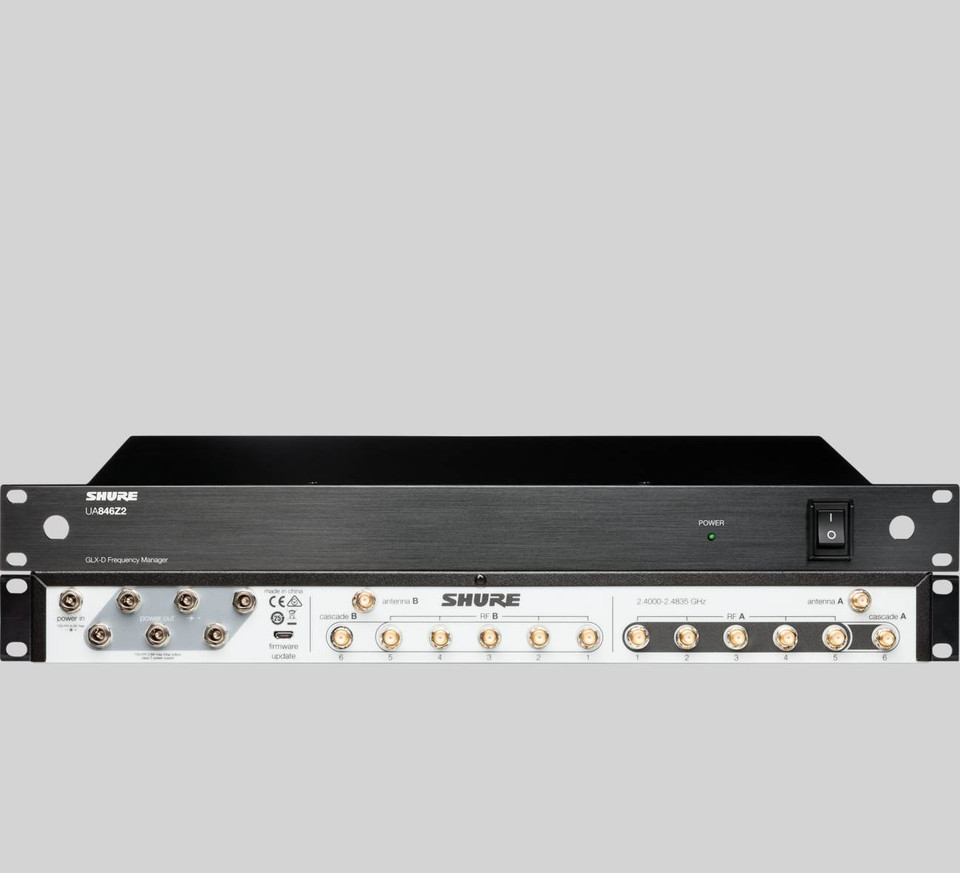 The UA846Z2 Frequency Manager for GLX-D Advanced connects up to six GLXD4R receivers, providing rock-solid RF performance through patented data communication. GLX-D Rack Mount Digital Wireless System channel count can be increased to 9 simultaneous systems in typical environments (11 under optimal conditions) with flexible antenna distribution options for multi-system applications.