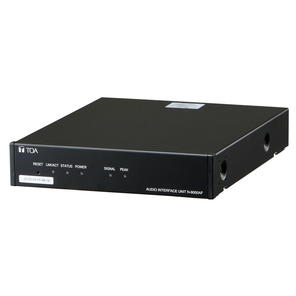 The N-8000AF is an Audio interface unit designed for use with TOA's packet intercom system (IP network-compatible intercom system) that employs the packet audio technology. It has an analog audio input and output, a time synchronization contact input, and each 8 contact inputs and outputs. Connecting the unit to the LAN permits recording of conversations, chime broadcast at regular intervals (time signal) and paging broadcast to be realized. It can be mounted in an EIA equipment rack (1U size) with the use of an optional rack mounting bracket or installed on a wall using an optional wall mounting bracket.