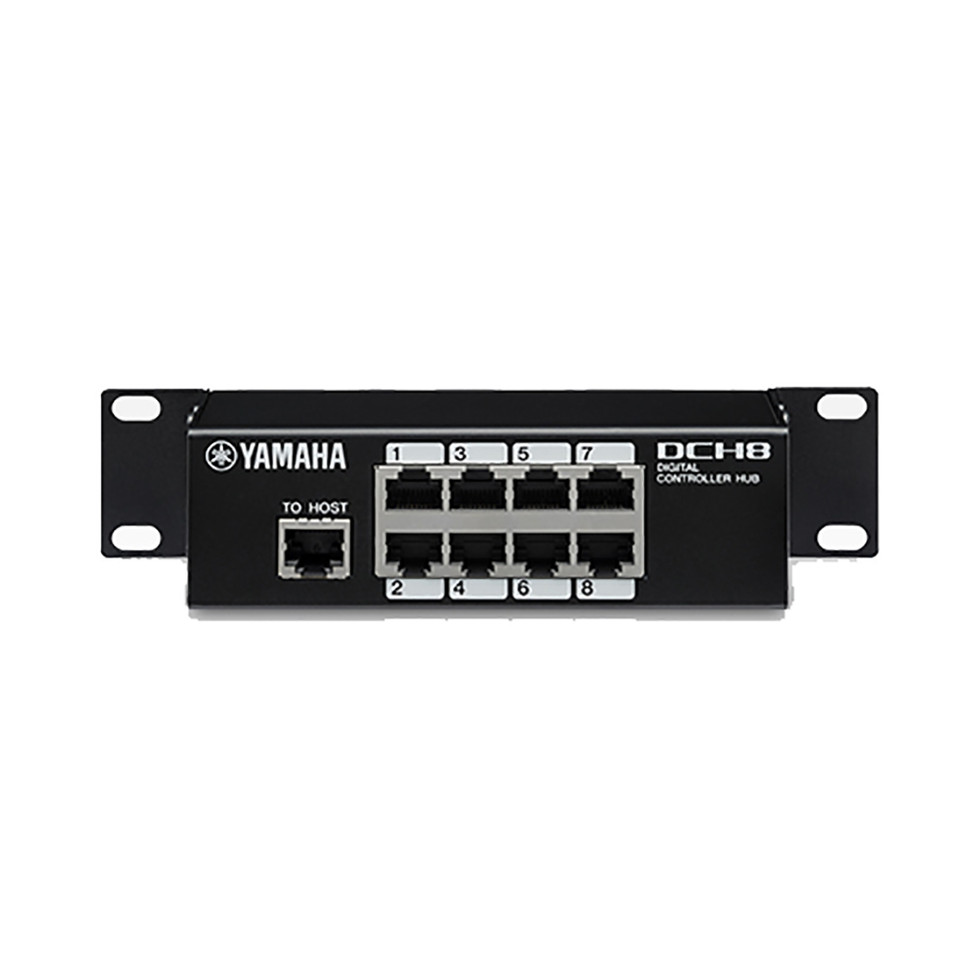The DCH8 functions as a relay device between the host device and DCP series, allowing a combination of star and daisy-chain connections. Power is supplied via the CAT5e cable from the host device, simplifying cabling and allowing flexible device layout. The distance between the host device and the furthest control panel must be less than 200 meters.Screw holes for the mounting flanges are provided on both the rear and sides, for flexible mounting in a variety of situations. Rack mount screws not supplied. The DCH8 Digital Controller Hub allows control lines for up to eight DCP series Digital Control Panel units to be connected to a Yamaha MRX7-D signal processor or MTX series matrix processor.Divides the control line from host devices such as the Yamaha MTX/MRX series into up to 8 lines.